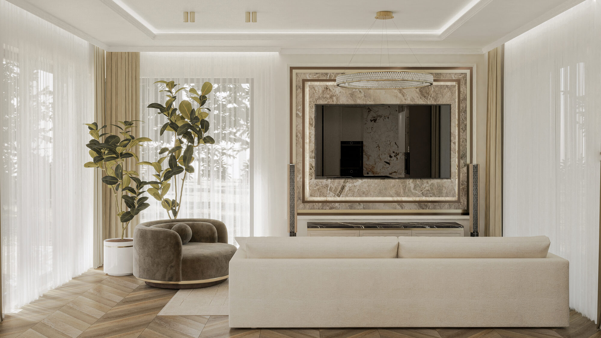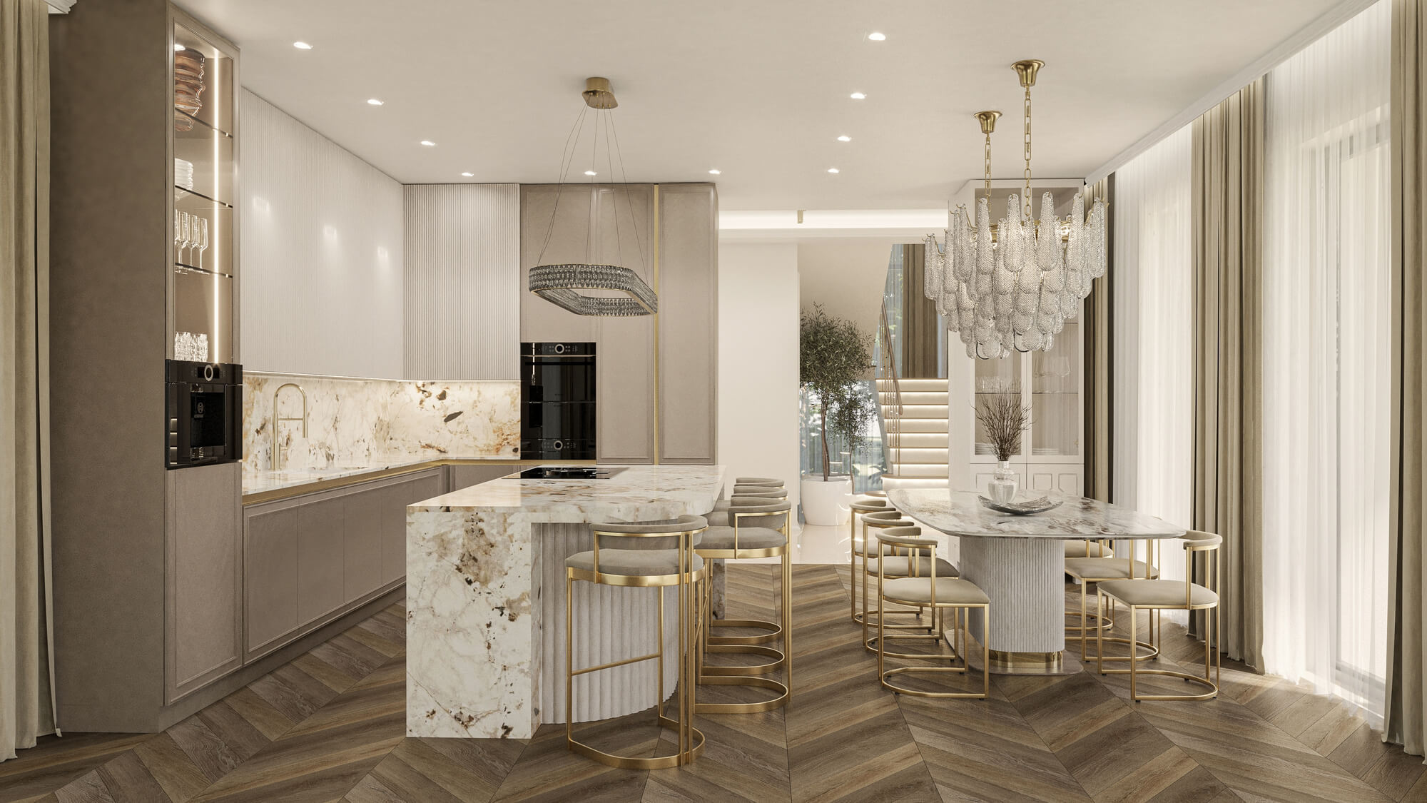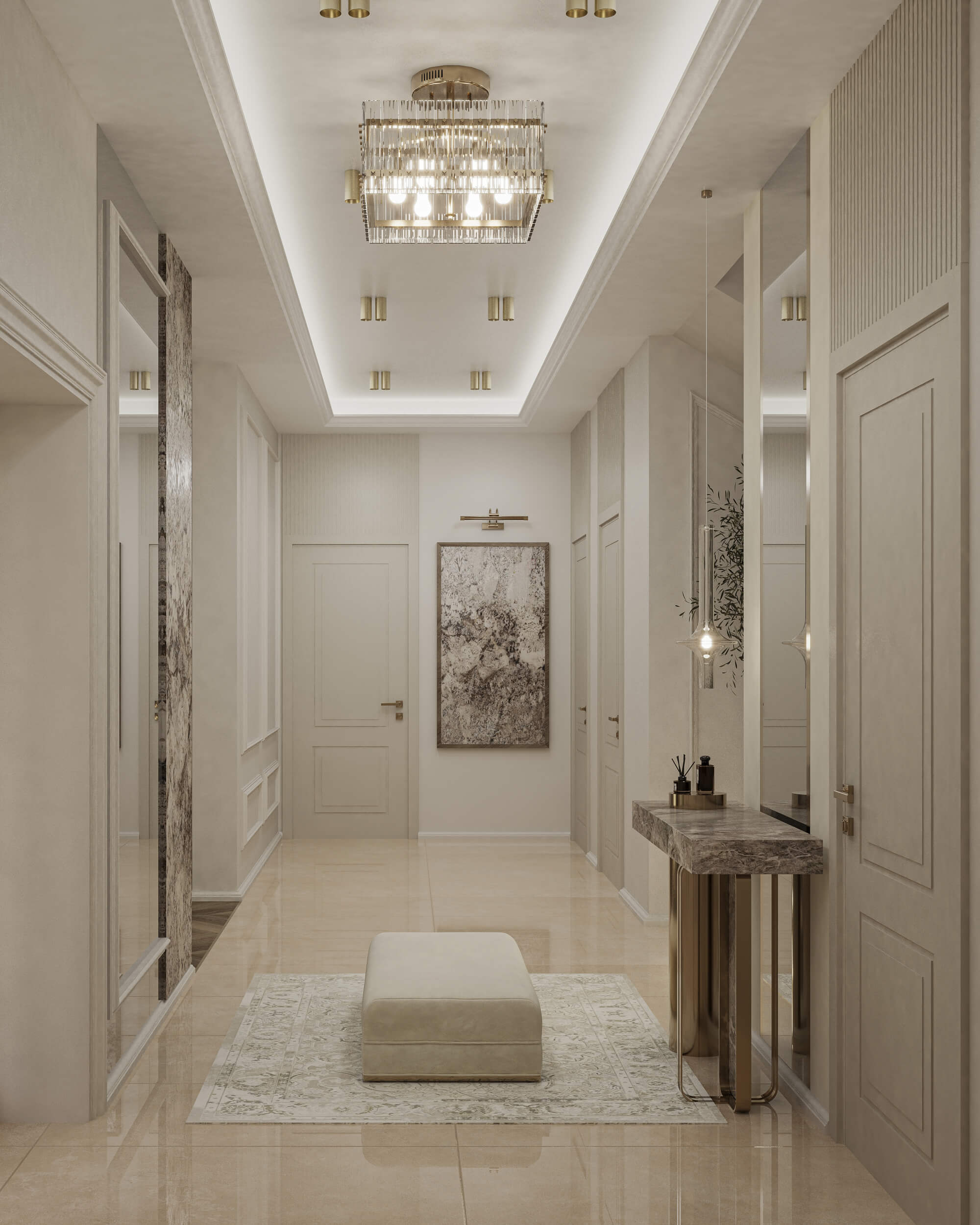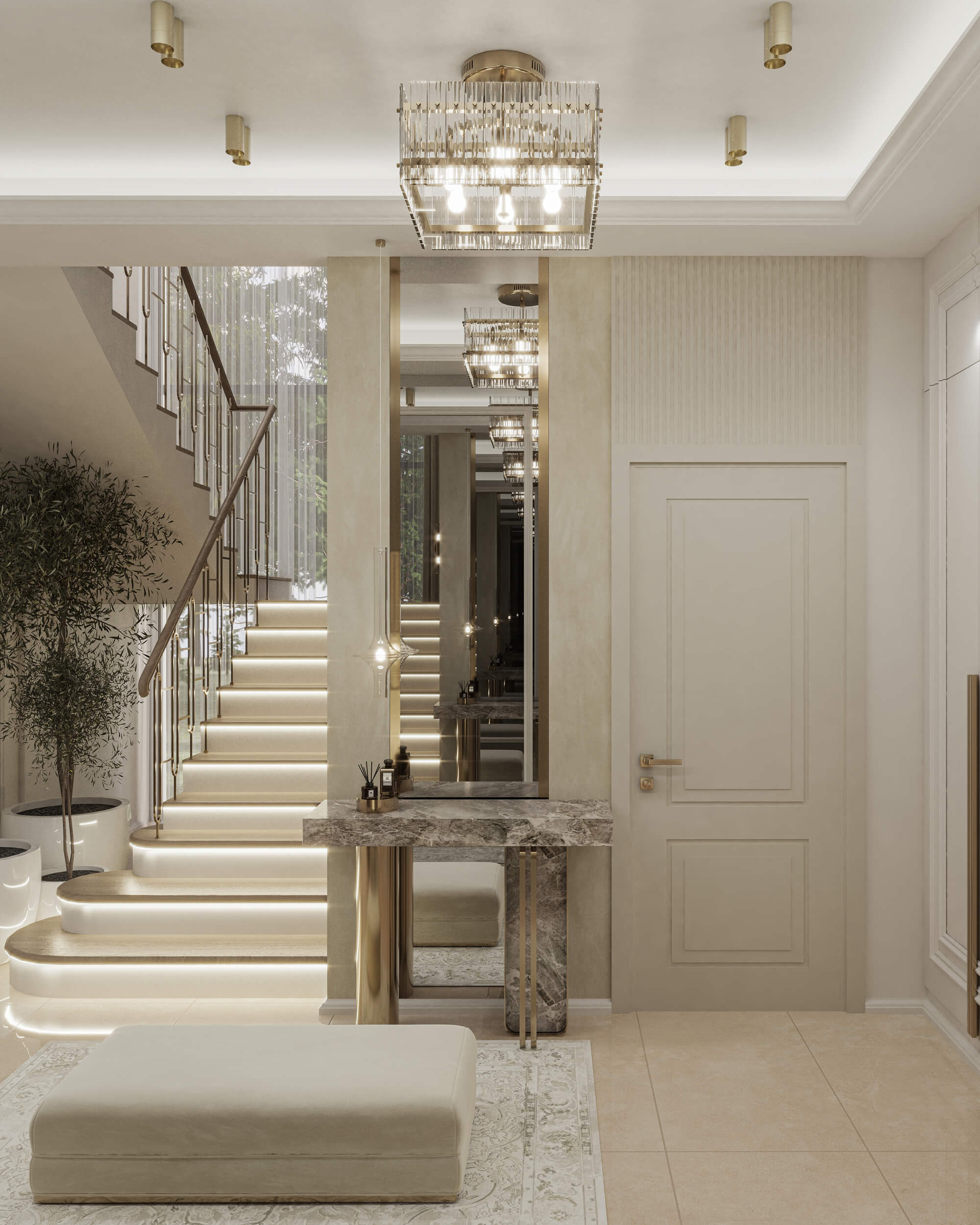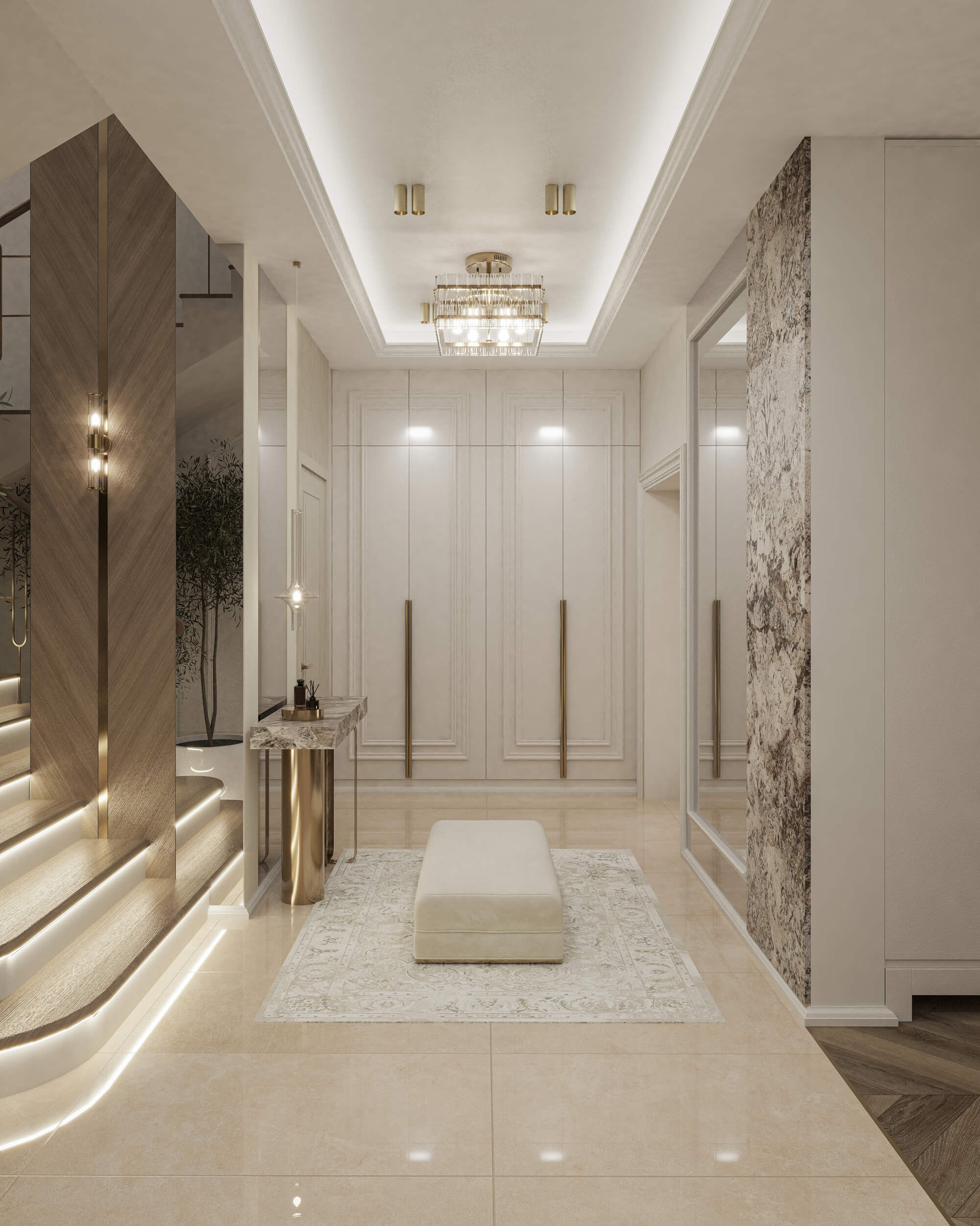 Homes filled with harmony, coziness, and grandeur. The modern classic interior perfectly complements the architectural part of the house. The project uses wallpaper, stone, dark accent wall colors, and playful upholstery fabrics for armchairs to create a sense of uniqueness, but at the same time, it blends into a cohesive home tailored to specific personalities.