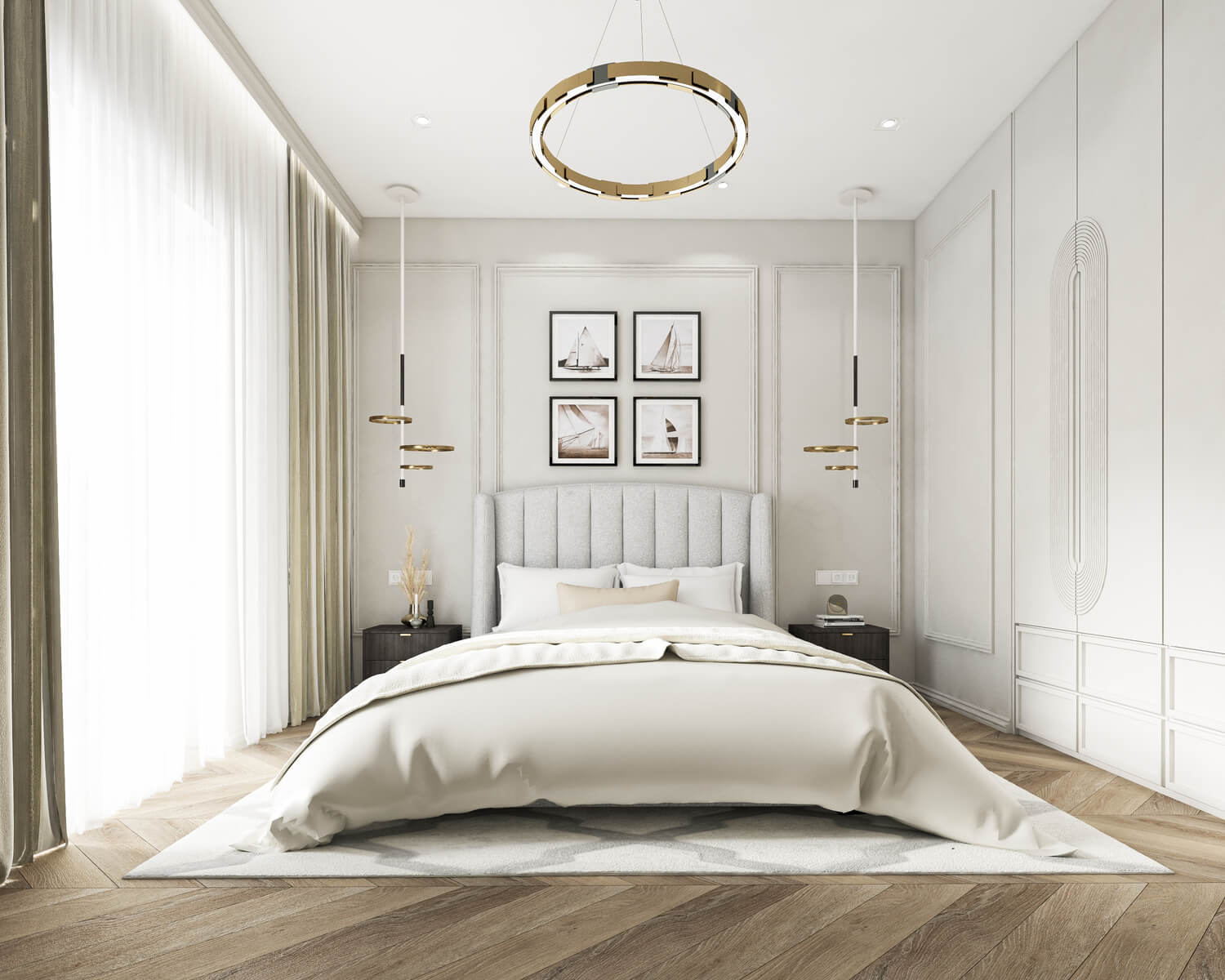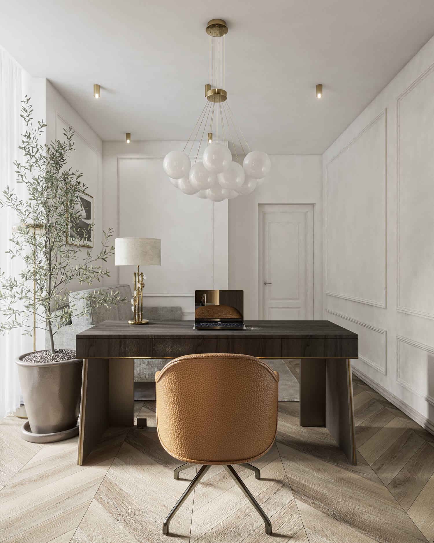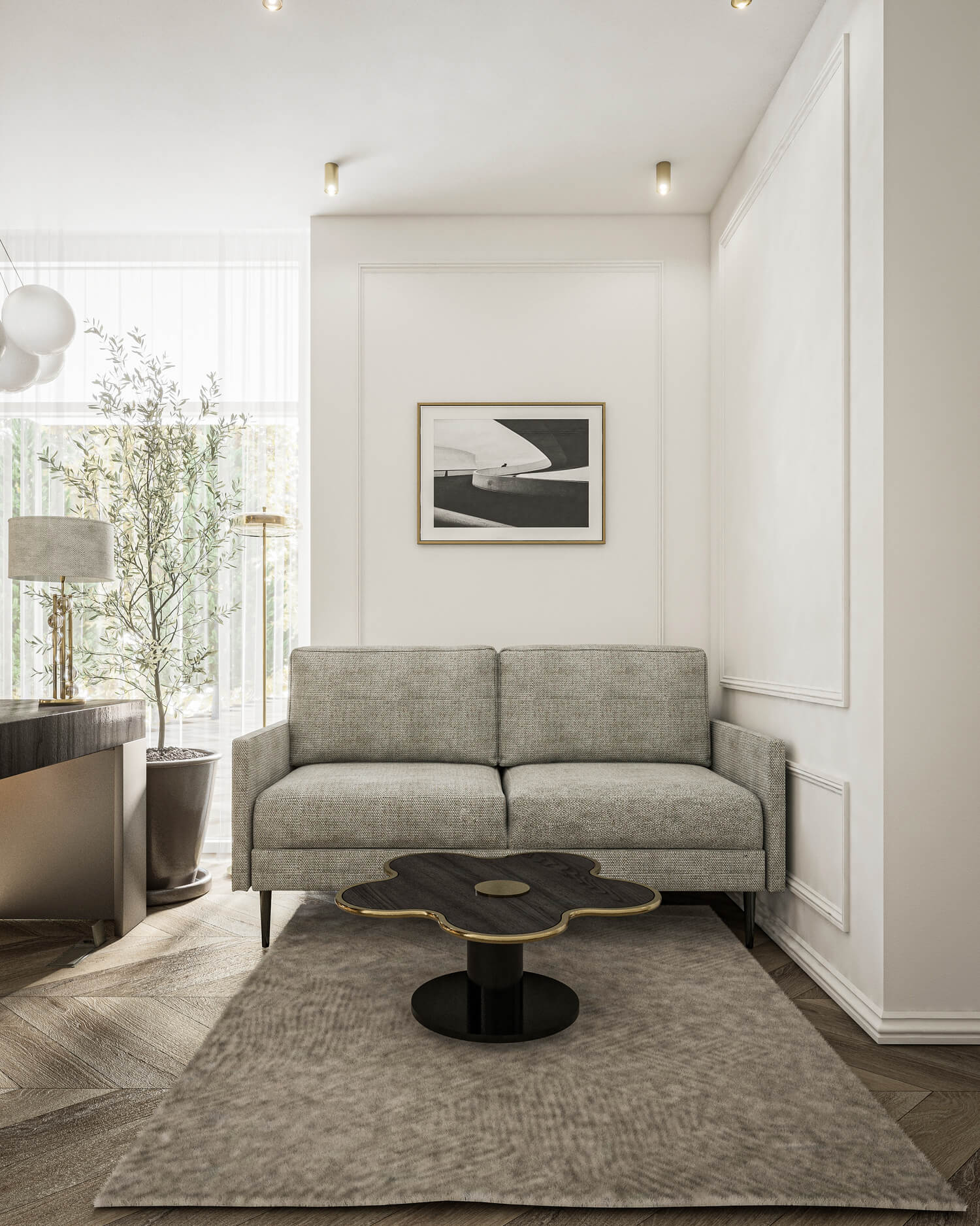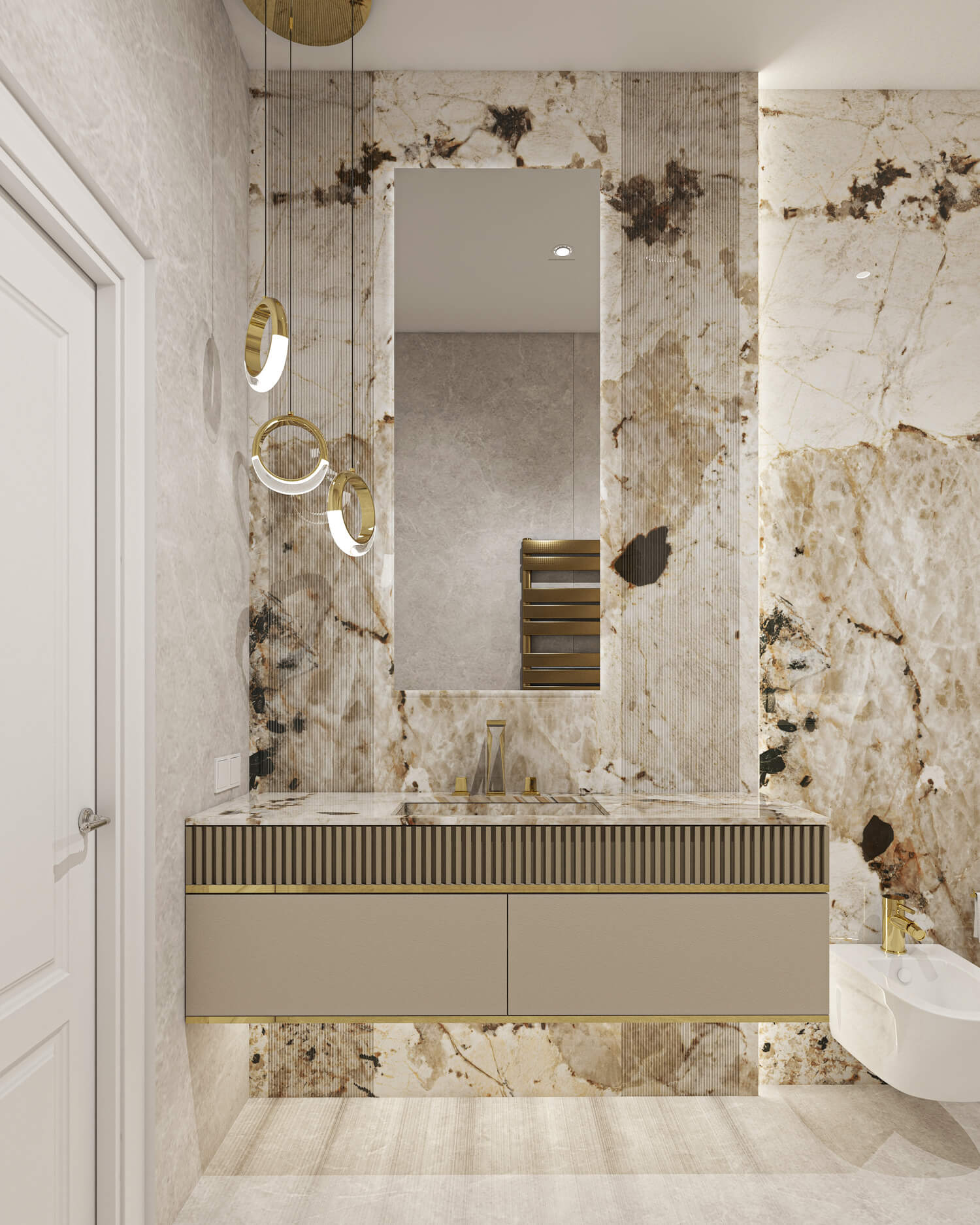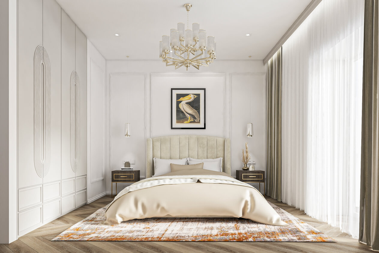 The unique, luxurious, yet cozy interior was created for a family that enjoys large gatherings and togetherness. The interior is characterized by shiny surfaces, the use of natural materials, and a strong focus on quality and durability. The rooms are spacious, unfurnished, and offer plenty of room to move around. The main and most representative feature of the house is the living room. It has a uniquely designed ceiling made of plasterboard. Large 160x320 cm stone tiles were chosen to cover the bathrooms. This decision was made in order to avoid repetitive joints between the tiles, while creating a sense of unity in the room.